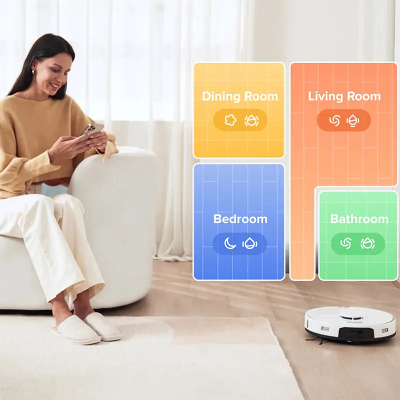 می خواهید یک منطقه خاص را جارو بزنید، لکه های روی کف را پاک کنید و یا سطح خانه ی خود را با ترکیبی از رطوبت تمییز کنید، تنها کافیست تلفن همراه خود را بردارید و هرچه آن چه لازم دارید را به جارو برقی دستور دهید.