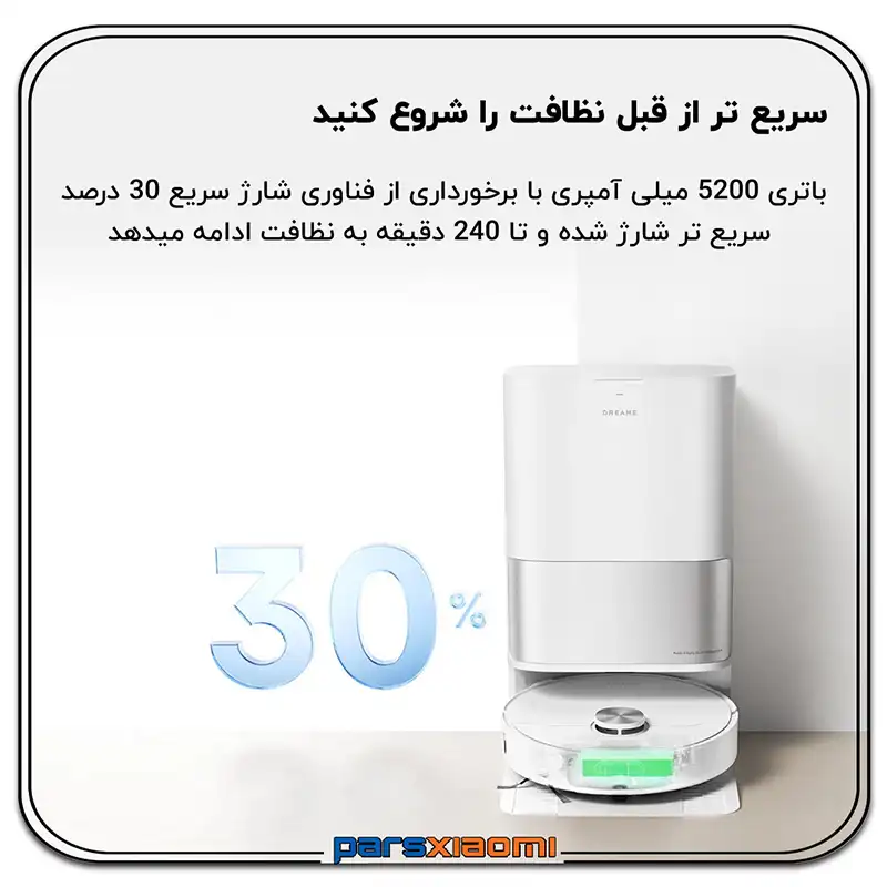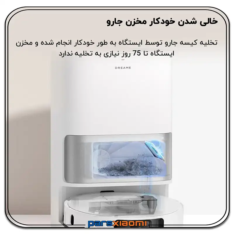 - تخلیه خودکار گرد و غبار: پس از هر بار نظافت، گرد و غبار جمعآوری شده به طور خودکار به کیسه گرد و غبار 3 لیتری موجود در ایستگاه منتقل میشود و نیاز به تخلیه دستی را تا 70 روز کاهش میدهد.
