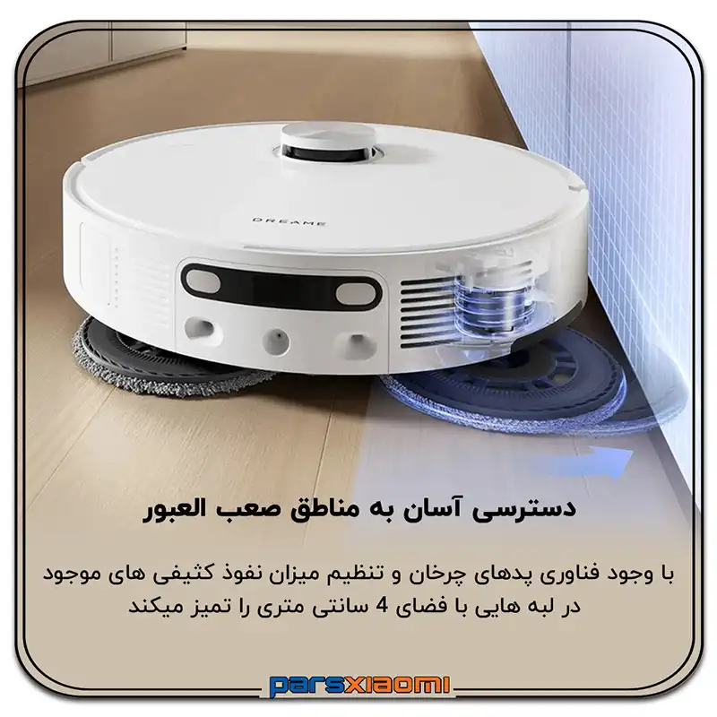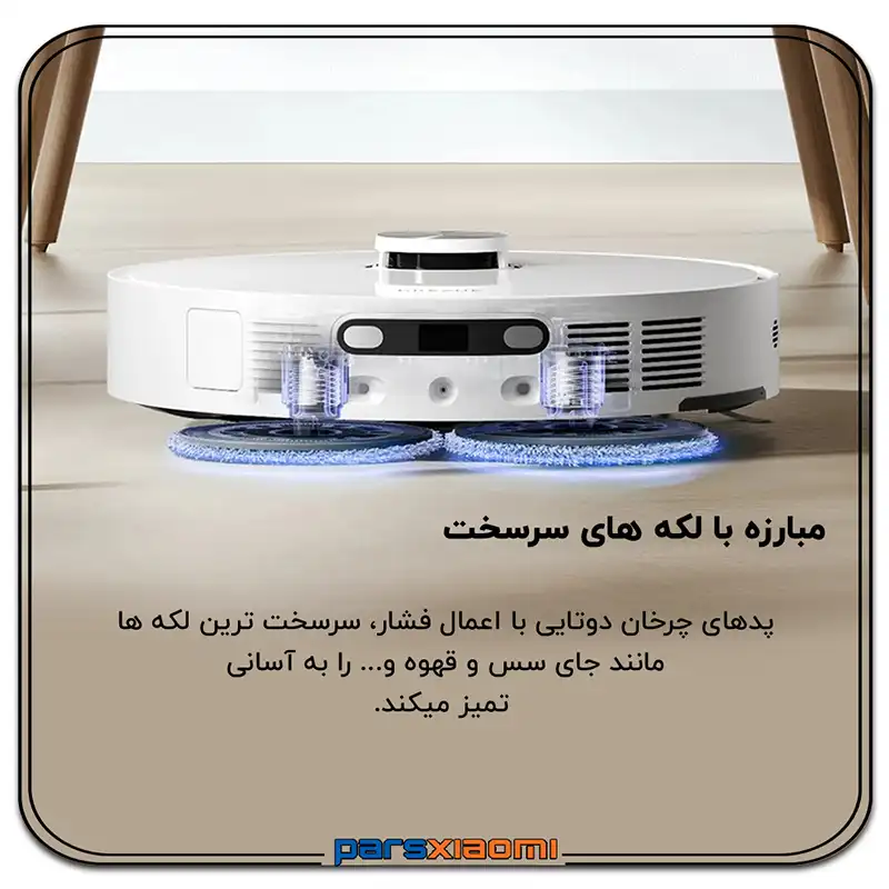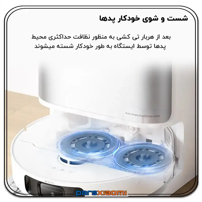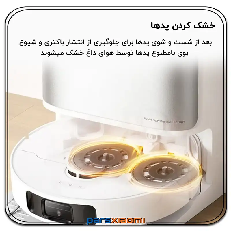 - شستشو و خشک کردن خودکار پدهای شستشو: پدهای میکروفایبر دوار پس از هر بار طی کشیدن به طور خودکار در ایستگاه شسته میشوند و سپس با هوای گرم خشک میگردند تا از رشد باکتری و بوی نامطبوع جلوگیری شود.