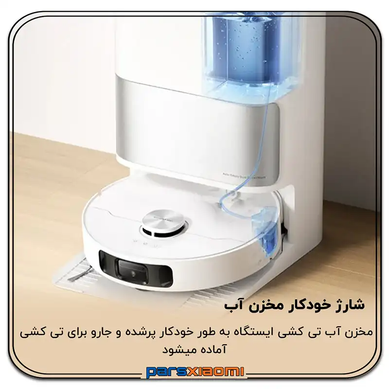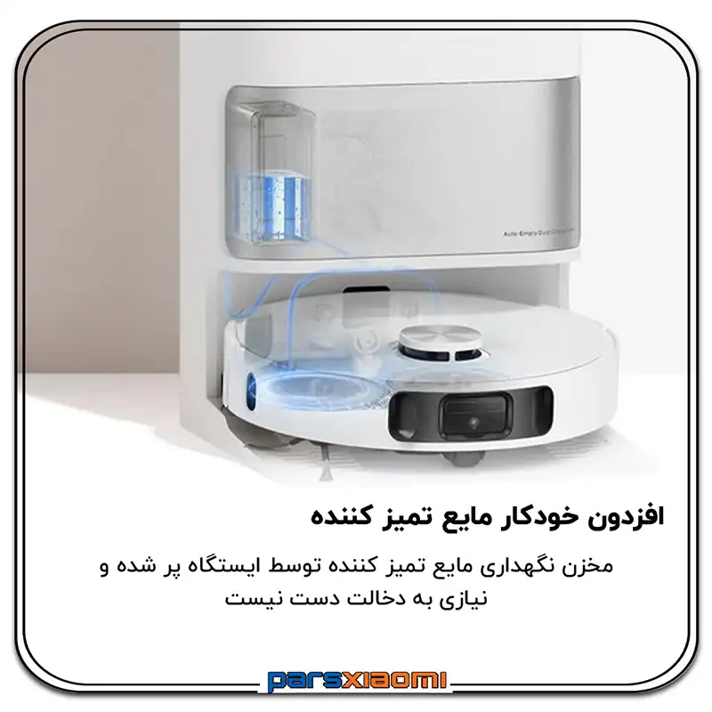 - پر کردن خودکار مخزن آب: مخزن آب جارو به طور خودکار از مخزن آب تمیز موجود در ایستگاه پر میشود و امکان طی کشیدن مساحت بیشتری را فراهم میکند.