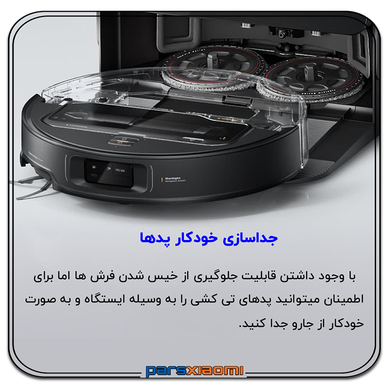 • قابلیت تشخیص فرش و بلند کردن خودکار پد شستشو: برای جلوگیری از خیس شدن فرش‌ها در هنگام جارو و طی کشیدن.