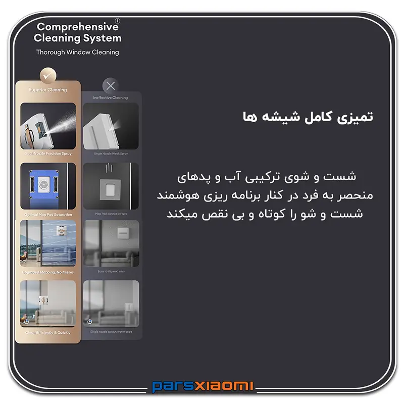 - قدرت مکش بالا: این ربات با قدرت مکش بیسابقه 11,000 پاسکال، به صورت ایمن به شیشه میچسبد و سختترین لکهها و آلودگیها را از بین میبرد.
