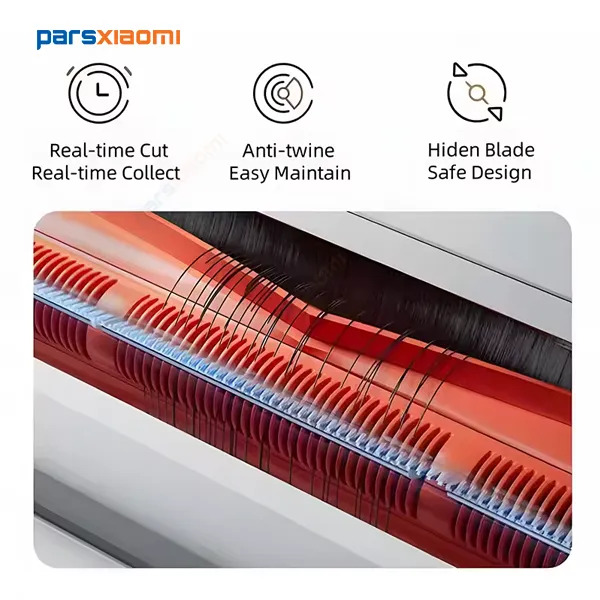 - قابلیت برش مو (Cutting Hair): ویژگی منحصربهفرد این برس، وجود تیغههای کوچک و تیز داخلی است که به طور خودکار موهای بلند و پرزهای درهم تنیده شده را در حین چرخش برش میدهند. این امر باعث میشود که موها به راحتی از برس جدا شده و به داخل مخزن گرد و غبار هدایت شوند.