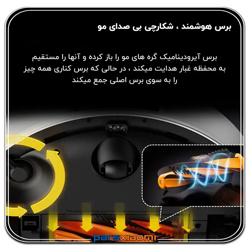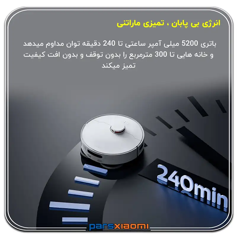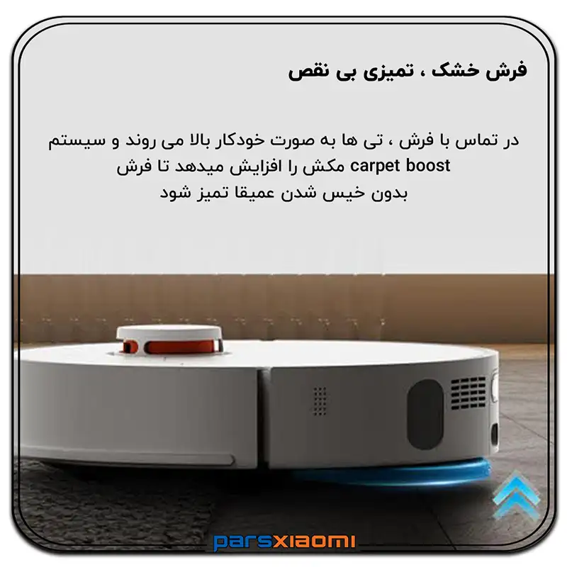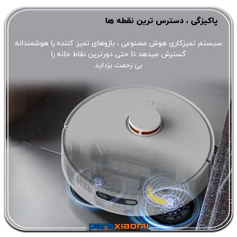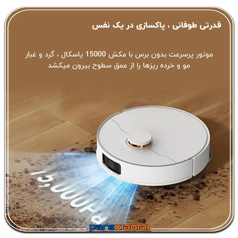 مکش فوقالعاده قوی: قدرت مکش (پاسکال) به ربات اجازه میدهد تا عمیقترین گرد و غبار، خردهریزهها و موهای حیوانات خانگی را از انواع کفپوشها (کف سخت، کاشی و فرش) بیرون بکشد.