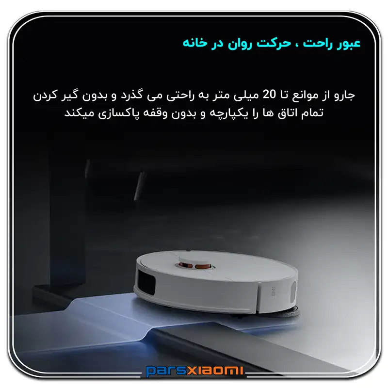 قدرت مانور بالا: این ربات به راحتی از آستانهها و موانع تا ارتفاع ۲ سانتیمتر (۲۰ میلیمتر) بالا میرود، بنابراین هیچ قسمتی از خانه از دید آن پنهان نمیماند.