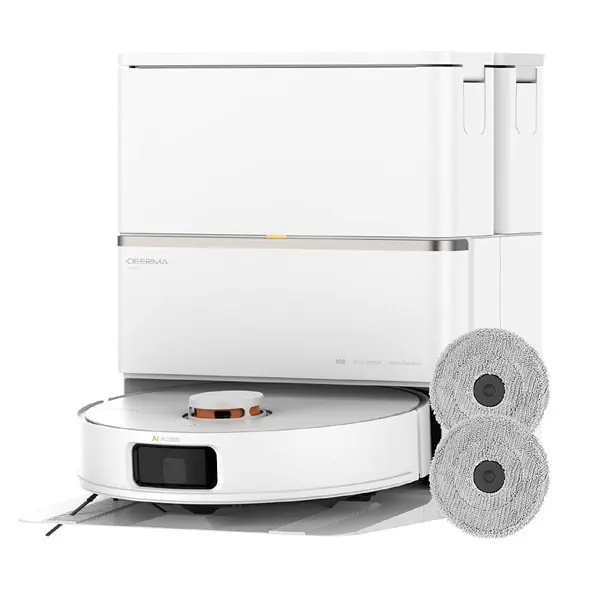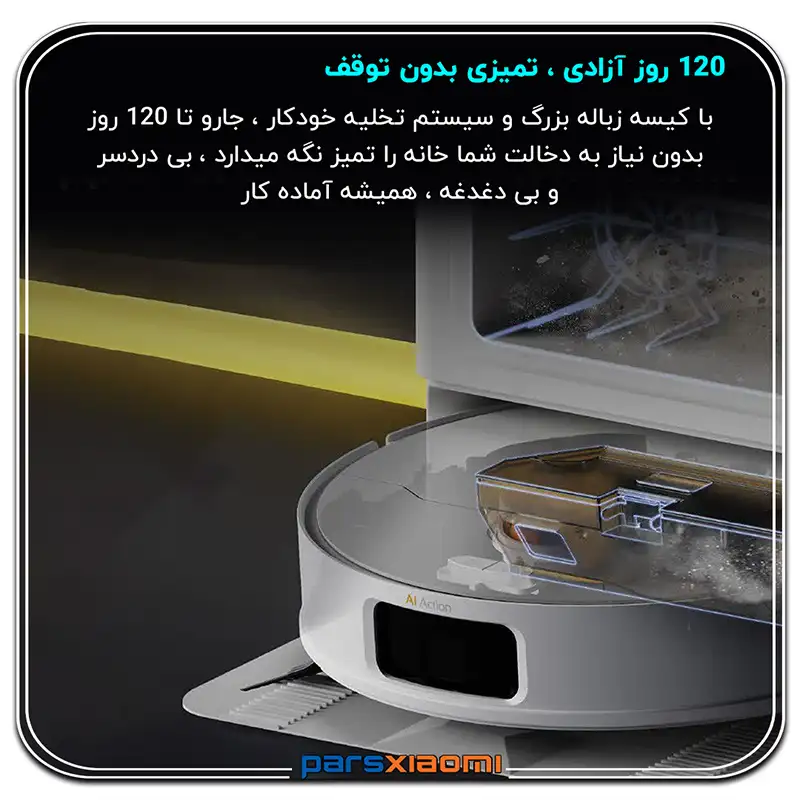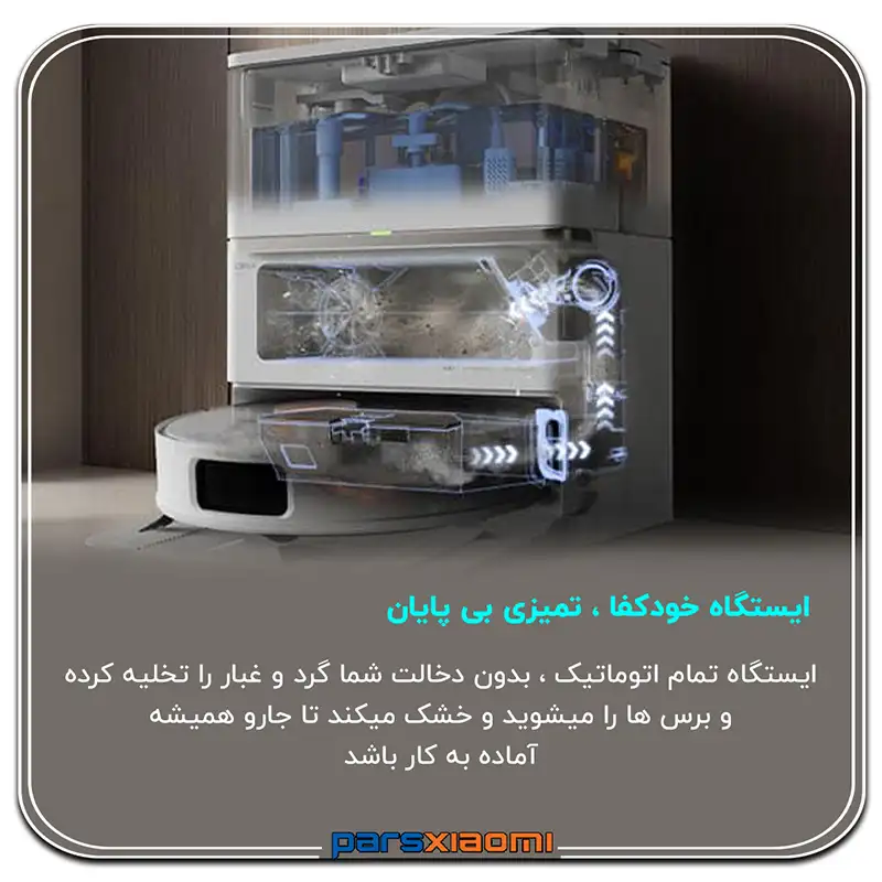 پایه خودتمیزشونده (Self-cleaning Base): داک به صورت اتوماتیک مخزن زباله ربات را تخلیه میکند.
