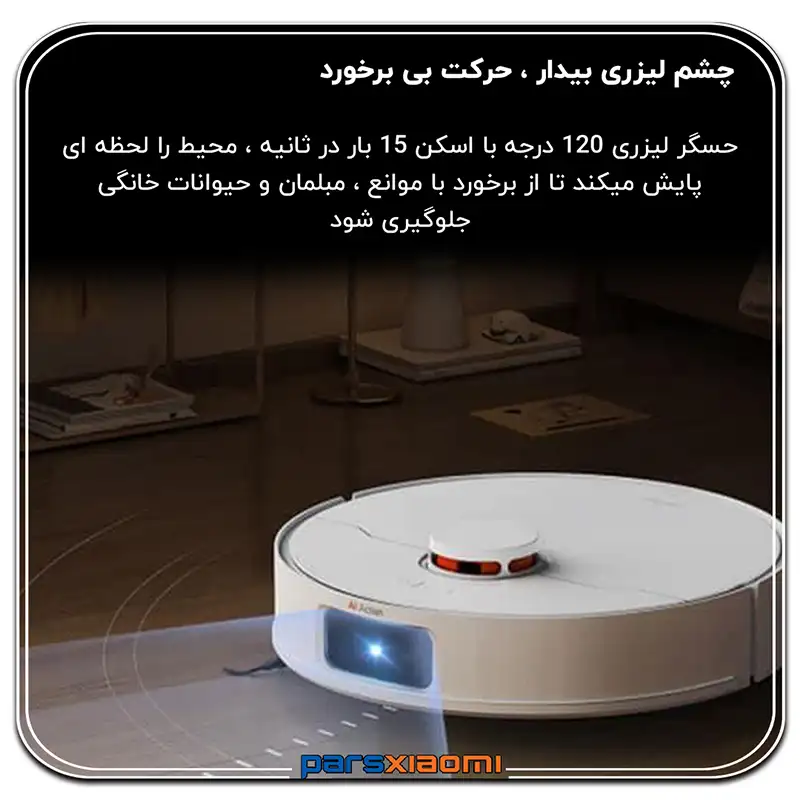 ناوبری لیزری (Lidar – LDS): با اسکن دقیق محیط، نقشههای کاملی از خانه ایجاد میکند تا ربات کوتاهترین و کارآمدترین مسیر نظافت را انتخاب کند و از حرکتهای تکراری جلوگیری نماید.