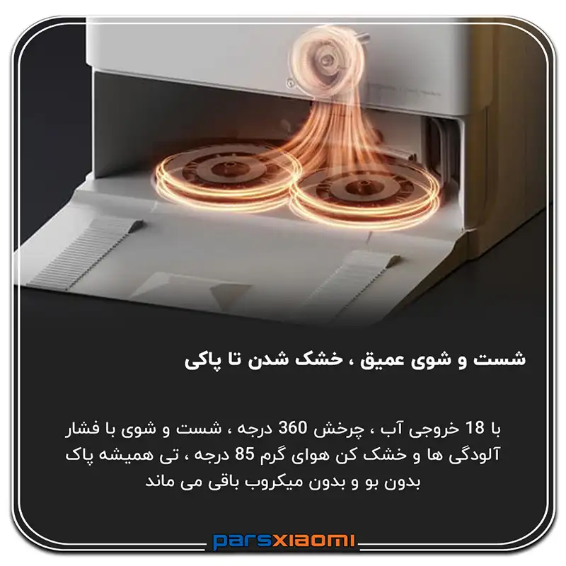 تیکشی لرزشی برای سایش: به جای تیکشی ساده، از یک پد ماپینگ لرزشی (Vibrating Mopping Pad) استفاده میکند. این لرزش، لکههای چسبیده را مانند ساییدن دستی پاک کرده و نظافتی عمیق و بدون لک (هم در حالت خشک و هم مرطوب) به شما تحویل میدهد.