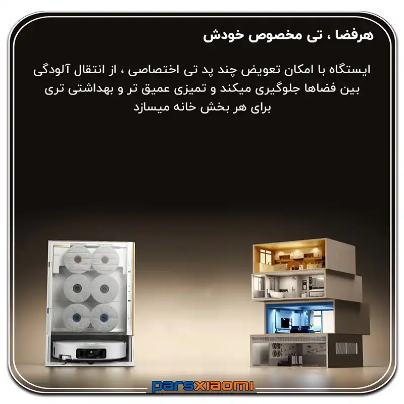 تغییر فیزیکی تی در ایستگاه: ربات در حین کار به داک بازمیگردد تا پدها را تعویض کند:
