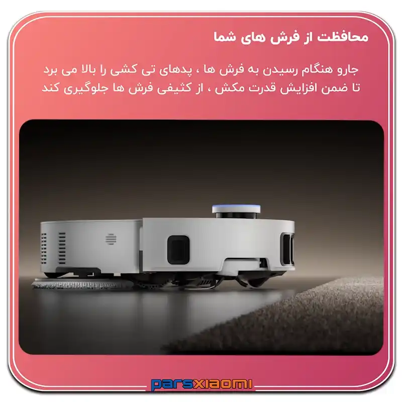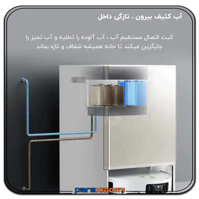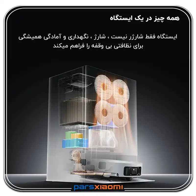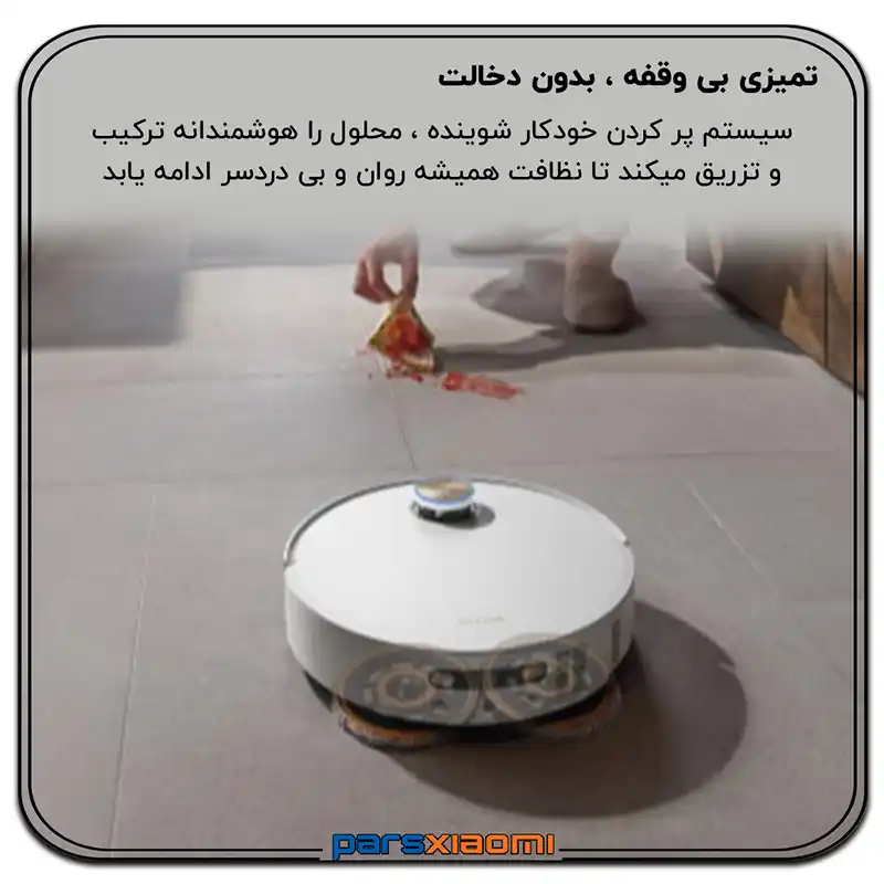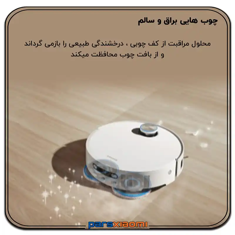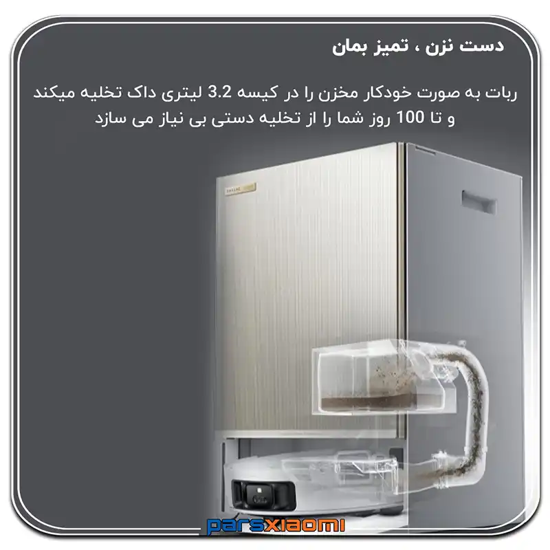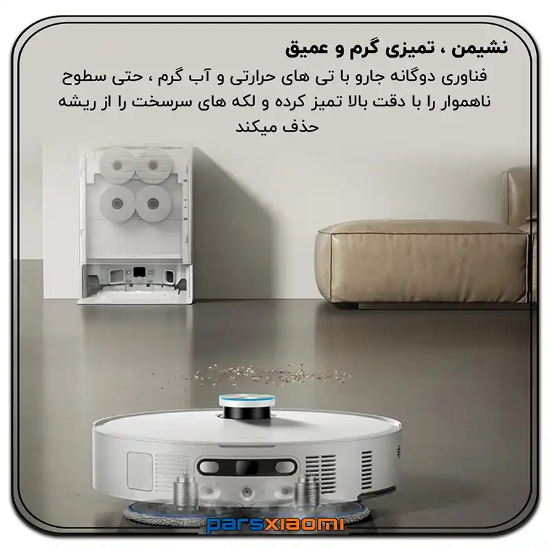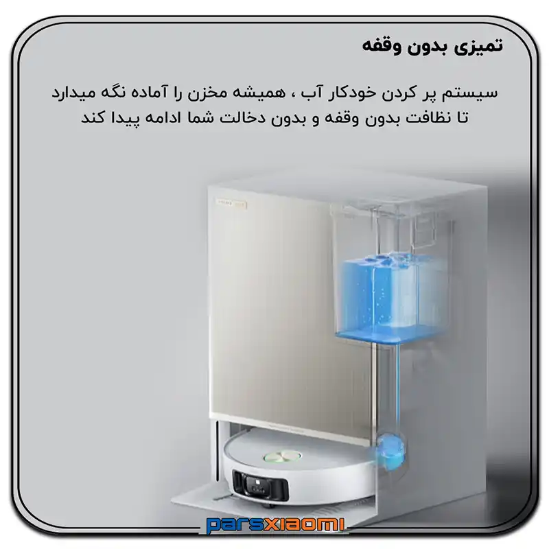 - Hardwood Care: محلول محافظتی برای حفظ جلا و بافت چوب و پارکت. ربات به صورت خودکار ترکیب مناسب را بر اساس نوع اتاق انتخاب و تزریق میکند.