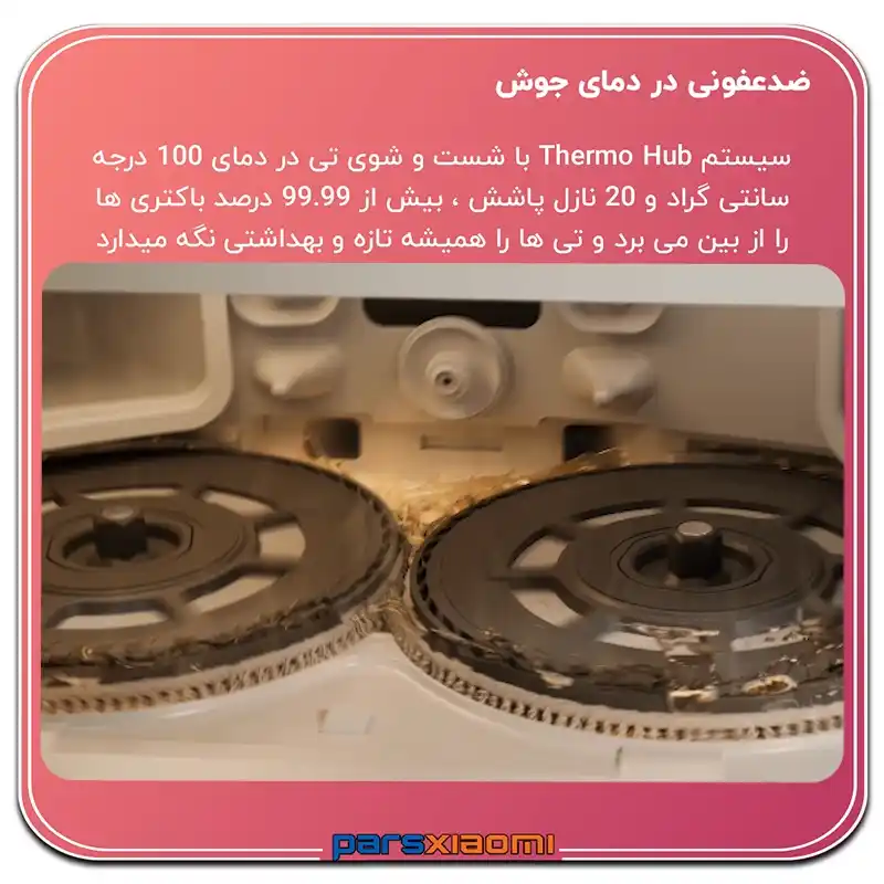 شستشو با آب جوش: سیستم ThermoHub™ پدها را با آب در دمای () میشوید. این دما سختترین چربیها را حل کرده و ۹۹.۹٪ باکتریها را نابود میکند.