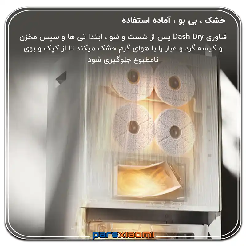 خشککن هوای گرم: پس از شستشو، پدها با جریان هوای گرم خشک میشوند تا از ایجاد بوی نم و رشد کپک جلوگیری شود.