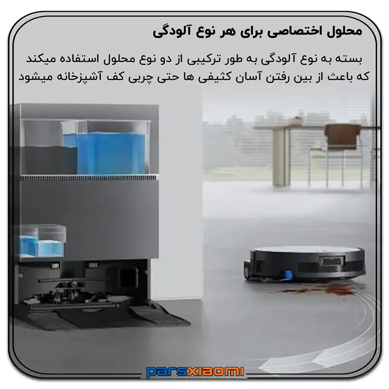 - Double-Effect Solutions: تشخیص هوشمند مواد شوینده: ایستگاه به صورت هوشمند بین مایع شوینده عادی و مایع سنگین (Heavy-Duty) سوئیچ میکند. پس از نظافت آشپزخانه یا اتاق غذاخوری، پد تی به صورت خودکار با قویترین فرمول شسته میشود.