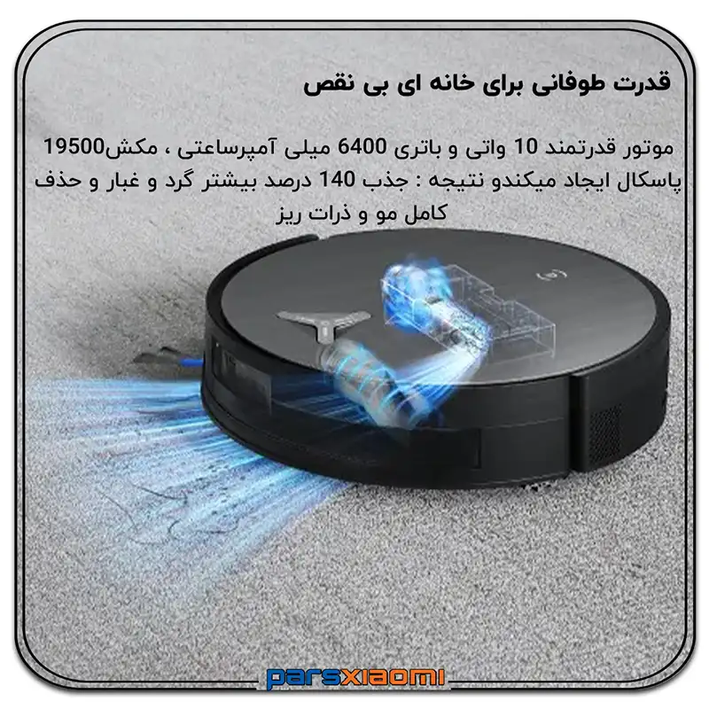 - قدرت 19,500 پاسکال (Pa): موتور قدرتمند 100 واتی و باتری 6400 میلیآمپر ساعتی، مکشی عظیم و بیمانند را تولید میکند که گرد و غبار ریز، موی حیوانات خانگی و ذرات بزرگ را با 100% کارایی جمعآوری میکند.