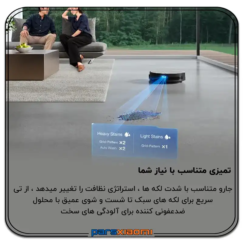 - AI Stain Detection: هدفگیری لکهها: هوش مصنوعی لکهها را تشخیص میدهد و بسته به شدت کثیفی، حالت تیکشی عمیق با دو بار عبور ضربدری را فعال میکند تا لکه از بین برود و آلودگی متقاطع رخ ندهد.