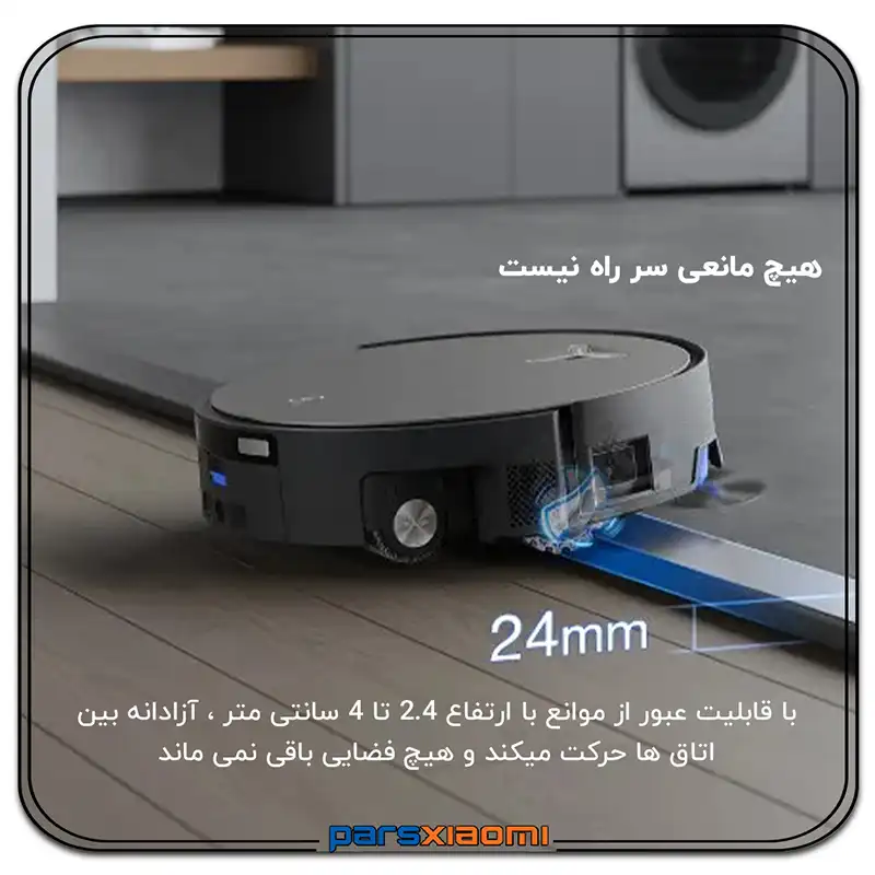 - TruePass System: سیستم 4 چرخ محرک (4WD): با سیستم مکانیکی تطبیقی، ربات میتواند آستانههای تا 2.4 سانتیمتر و ریل درها تا 4 سانتیمتر را با اطمینان کامل و بدون گیر کردن، فتح کند و نظافت را بدون توقف ادامه دهد.