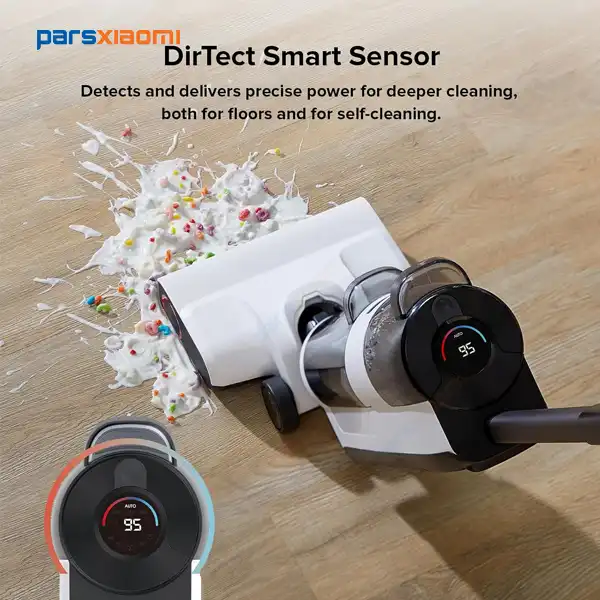 این جارو مجهز به حسگر هوشمند DirTect است که به طور خودکار میزان آلودگی سطح را تشخیص داده و قدرت مکش و الگوی حرکتی خود را تنظیم میکند. این ویژگی باعث میشود هیچ لکهای از قلم نیفتد.