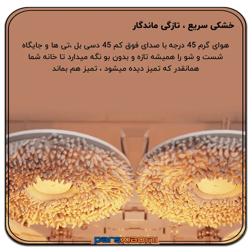 خشککن هوای گرم: پدها و پایه داک با هوای گرم خشک میشوند تا از رشد باکتریها، ایجاد کپک و بوی نامطبوع جلوگیری شود (با نویز خشککن پایین ۴۵ دسیبل).