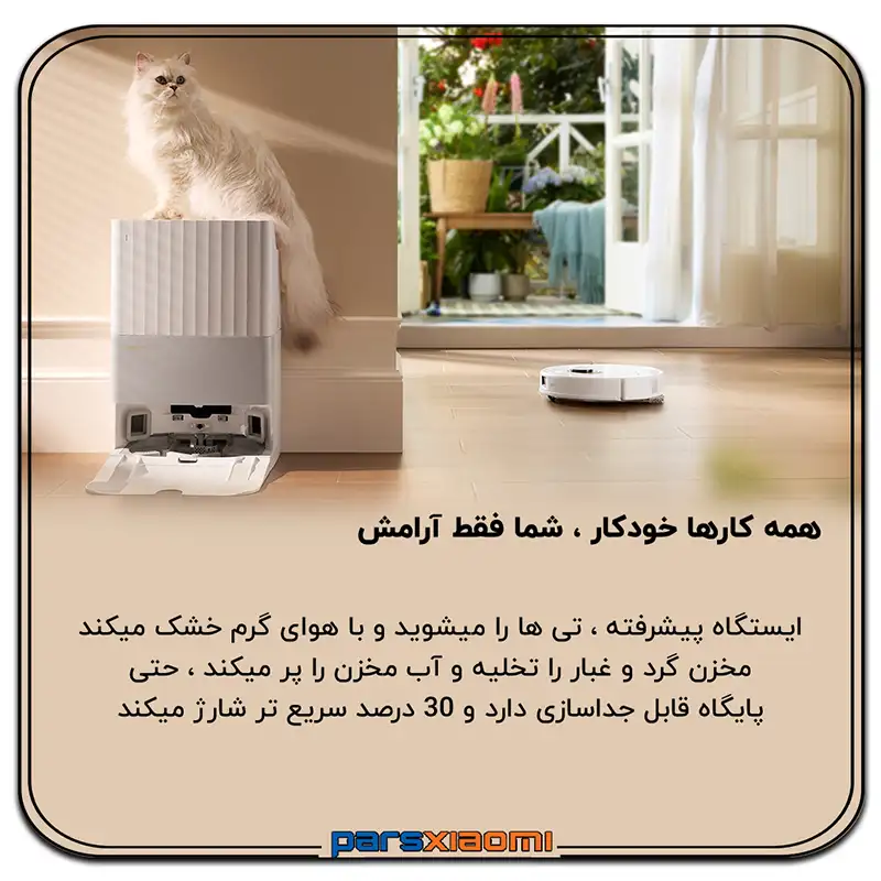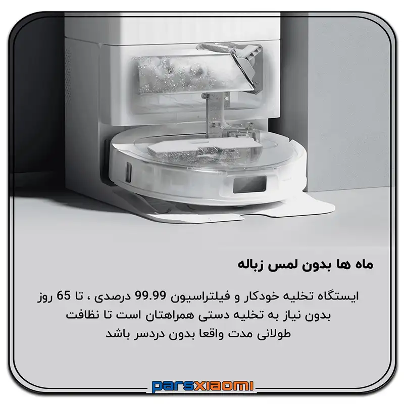 تخلیه خودکار گرد و غبار: زبالههای ربات به صورت خودکار در یک کیسه ذخیره بزرگ تخلیه میشوند که تا ۷ تا ۹ هفته نیاز به خالی کردن دستی ندارد.