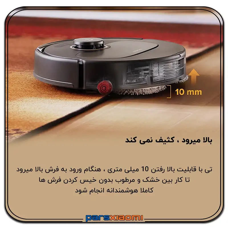 بالابر خودکار تی (): هنگامی که ربات فرشهای کمپرز را تشخیص میدهد، پدها به صورت خودکار تا ۱۰ میلیمتر بالا میروند تا از خیس شدن فرش جلوگیری شود.همچنین میتواند از موانع 2 سانتی عبور کند.