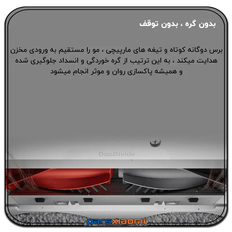 برس اصلی DuoDivide™: این برس با دو غلتک موازی و پرههای مارپیچ، موها را به سمت ورودی مرکزی سطل زباله هدایت میکند و از گره خوردگی و گرفتگی جلوگیری مینماید.