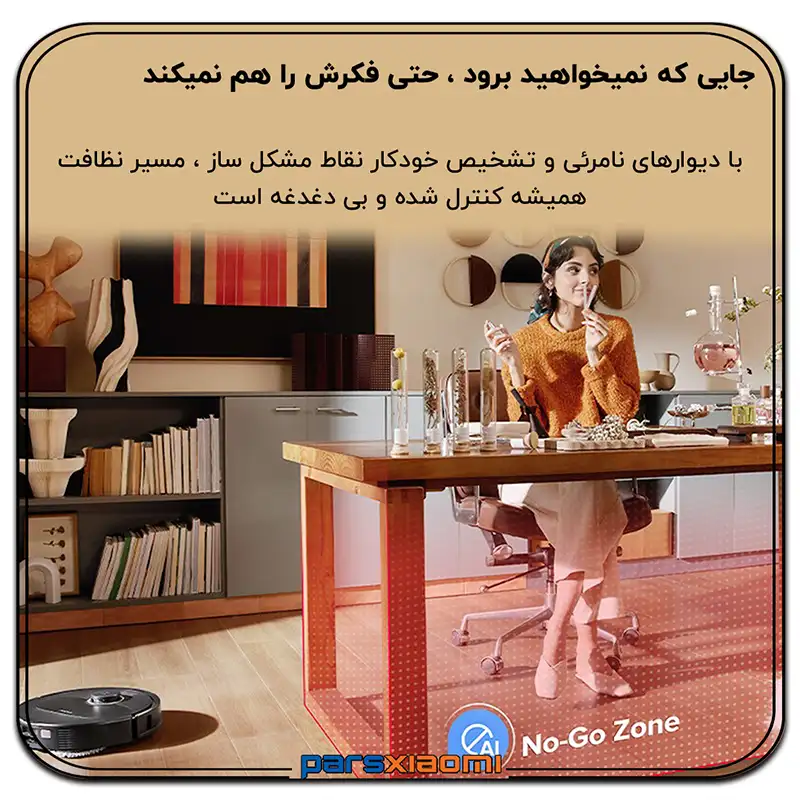 اجتناب واکنشی (Reactive Obstacle Avoidance): حسگرهای نور ساختاریافته، کابلها، اسباببازیها و پایههای مبلمان را به صورت لحظهای تشخیص داده و از آنها عبور میکنند. همچنین پیشنهاد میدهد تا مناطق مشکلساز مانند زیر صندلیها را به عنوان “مناطق ممنوعه” (No-Go Zones) تعریف کنید تا از گیر کردن ربات جلوگیری شود.