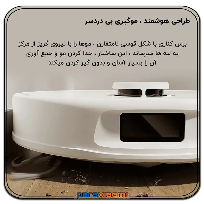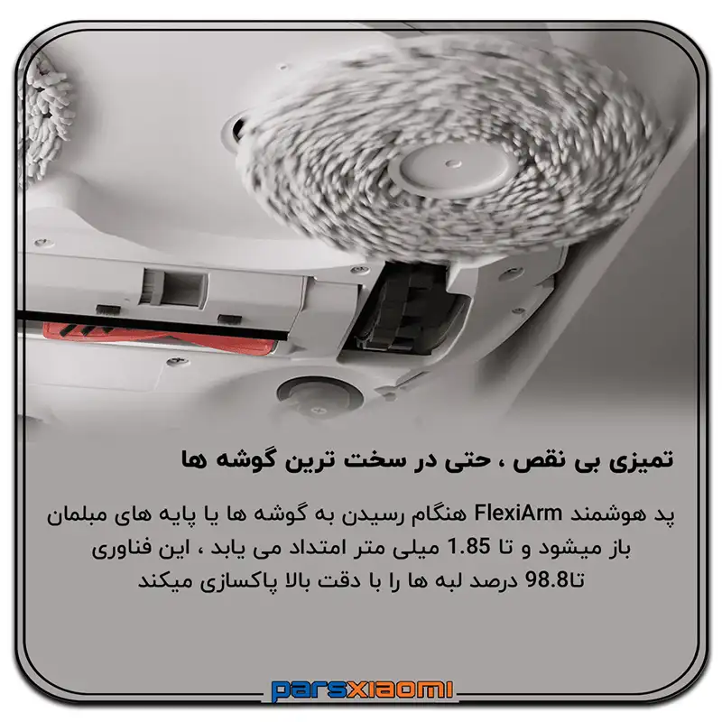تیکشی لبهای FlexiArm: این قابلیت هوشمند، به ربات اجازه میدهد تا بازوی تیکش خود را به صورت خودکار تمدید کند و به گوشههای پنهان، دور پایههای مبلمان و دیوارها (تا فاصله ۱.۸۵ میلیمتر از لبه) دست یابد و پوشش لبهها را تا ۹۸.۸۰٪ برساند.