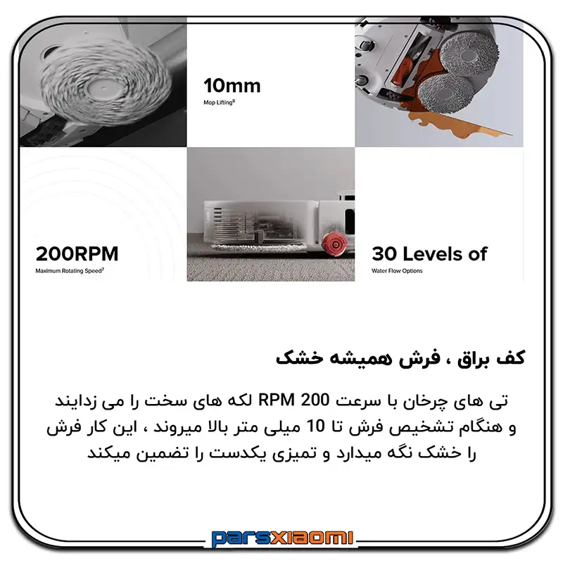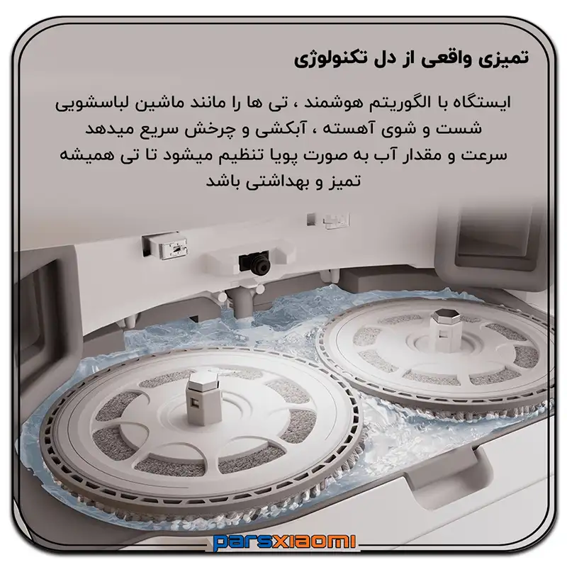 دو پد چرخاننده (Dual Spinning Mops): دو پد تیکش با سرعت چرخش بالا (حداکثر ۲۰۰ دور در دقیقه)، لکههای سرسخت را میسابند و پاک میکنند.