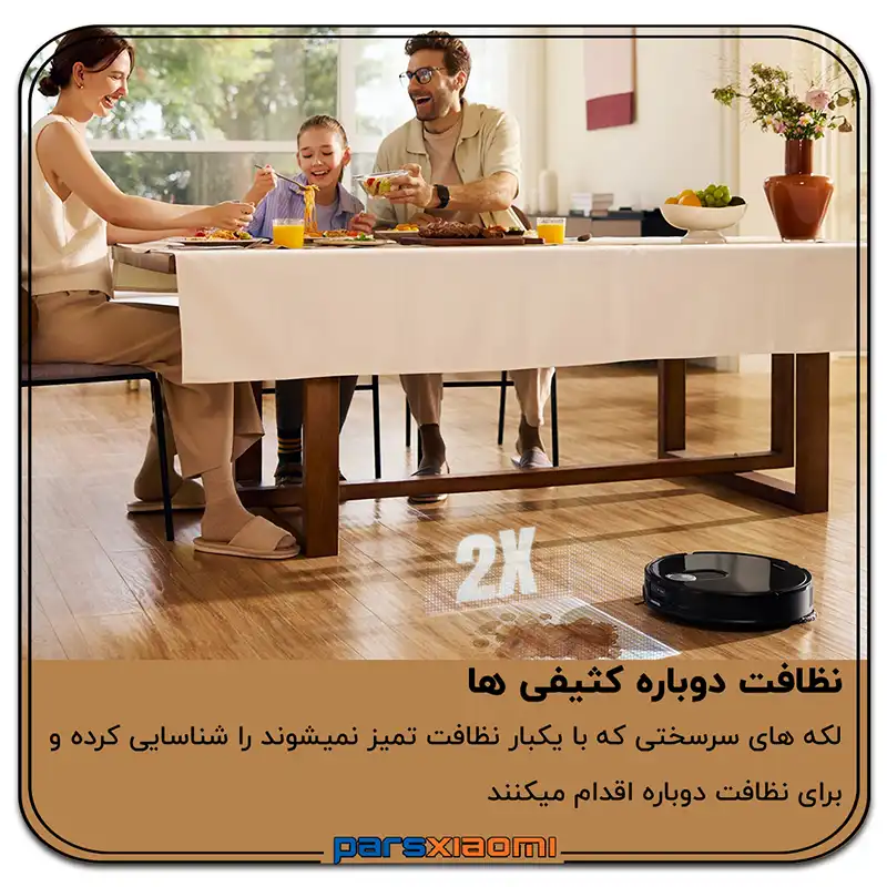 - تشخیص هوشمند کثیفی (Intelligent Dirt Detection): سیستم به طور مداوم میزان کثیفی پدها را در حین شستشو نظارت میکند و مدت زمان شستشو را تنظیم مینماید. برای کفهای بسیار کثیف، داک به طور خودکار یک مرحله تیکشی اضافی را فعال میکند (این ویژگی باید به صورت دستی در اپلیکیشن فعال شود).