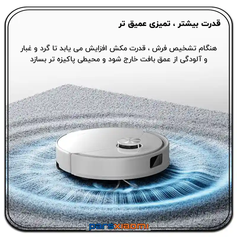 - قدرت مکش (HyperForce): این ربات با یکی از بالاترین قدرتهای مکش، تضمین میکند که ذرات ریز، گرد و غبار پنهان و موهای حیوانات خانگی از عمیقترین نقاط فرش و شکافهای کف سخت خارج شوند. این قدرت به صورت هوشمند روی فرشها با قابلیت Auto Boost on Carpet افزایش مییابد.