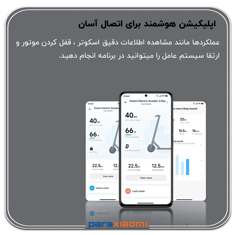 - اتصال بلوتوث و اپلیکیشن: از طریق اپلیکیشن هوشمند شیائومی، میتوانید اسکوتر را به گوشی هوشمند خود متصل کرده و تنظیمات مختلفی را اعمال کنید.