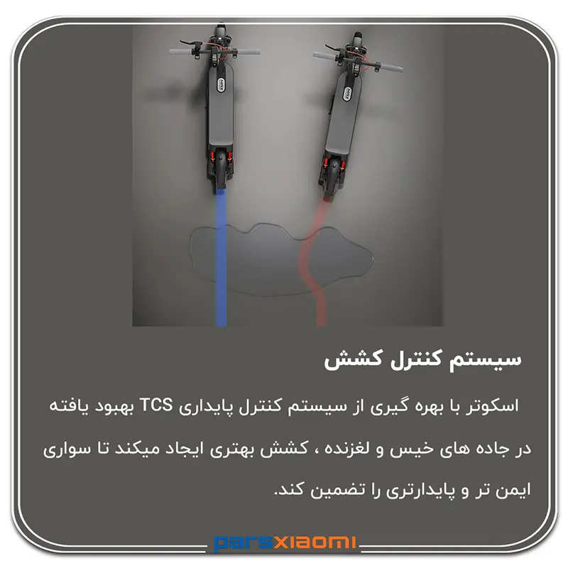 - سیستم کنترل کشش (TCS) ضد لغزش: این سیستم ایمنی، پایداری اسکوتر را در سطوح لغزنده مانند جادههای خیس تضمین میکند.