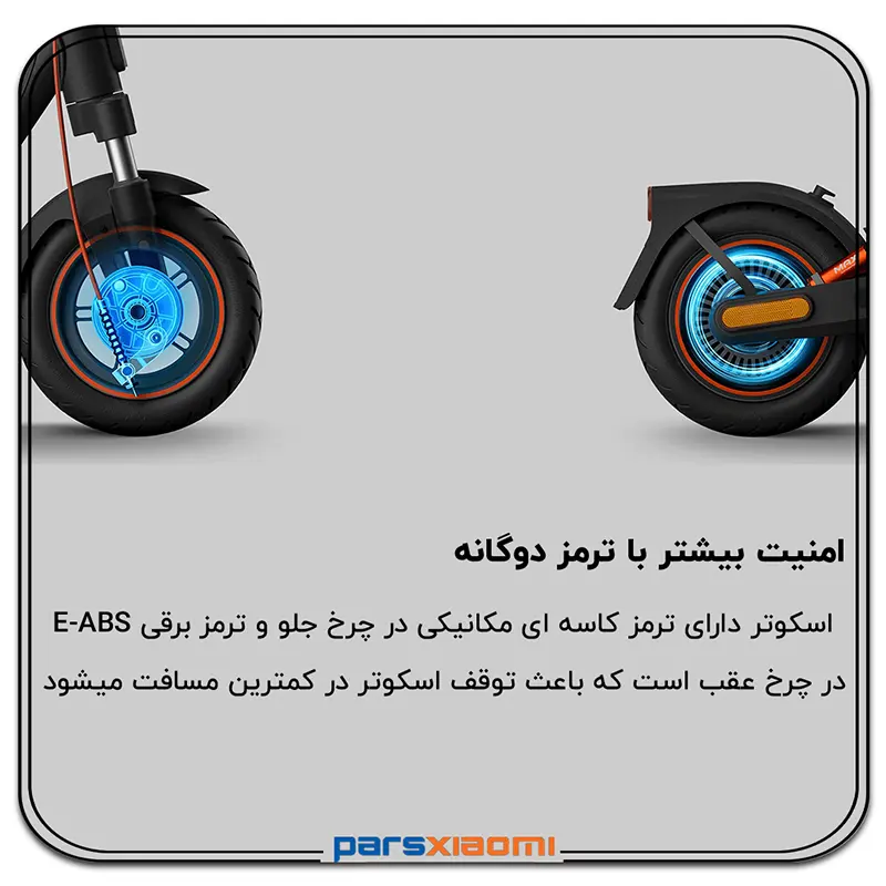 - ترمزهای دوگانه: شامل یک ترمز درام مکانیکی در چرخ جلو و یک ترمز الکتریکی E-ABS در چرخ عقب برای توقف سریع و ایمن.