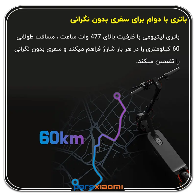 - برد 60 کیلومتر: با یک بار شارژ کامل، میتوانید تا 60 کیلومتر مسافت را طی کنید، که نیاز به شارژ مکرر را به حداقل میرساند. این برد بلند به لطف یک باتری لیتیوم با ظرفیت 477 واتساعت میسر شده است.