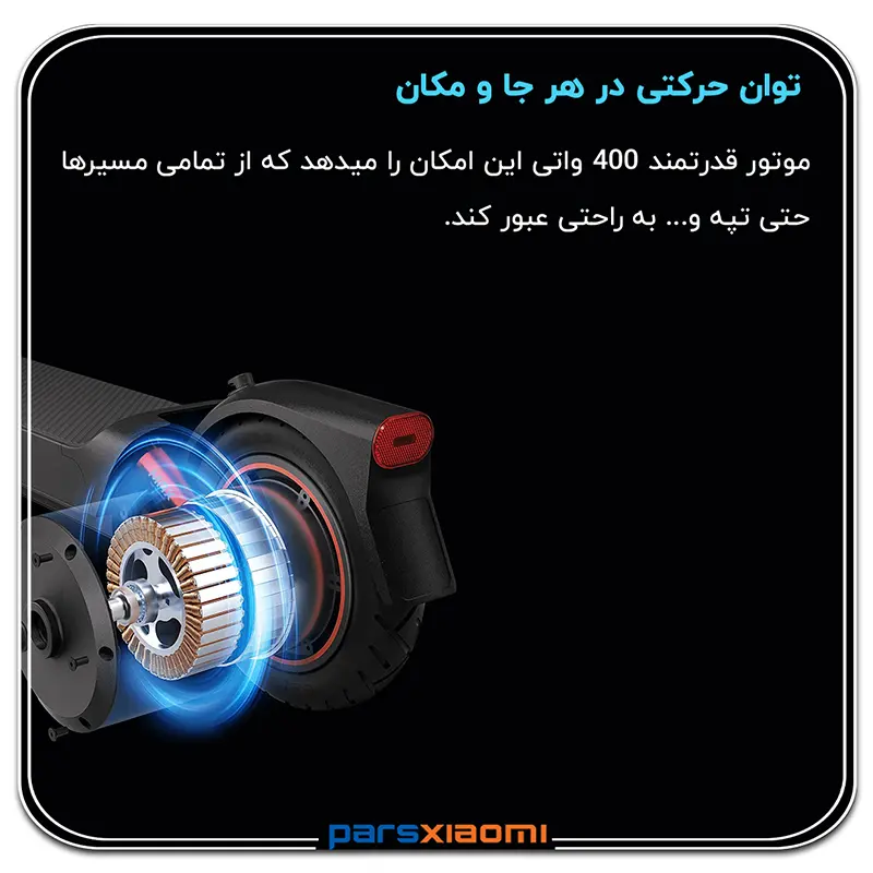 - موتور قدرتمند 1000 وات: مجهز به یک موتور بدون برس (brushless) با حداکثر توان 1000 وات (توان نامی 400 وات) در چرخ عقب، این اسکوتر شتابگیری سریع و عملکردی قدرتمند را تضمین میکند.