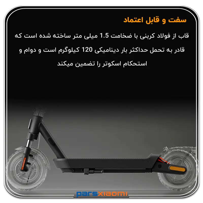 - قاب کربن استیل 1.5 میلیمتری: قاب محکم از جنس کربن استیل با ضخامت 1.5 میلیمتر، دوام و پایداری اسکوتر را تضمین میکند و حداکثر بار پویا تا 120 کیلوگرم را پشتیبانی میکند.