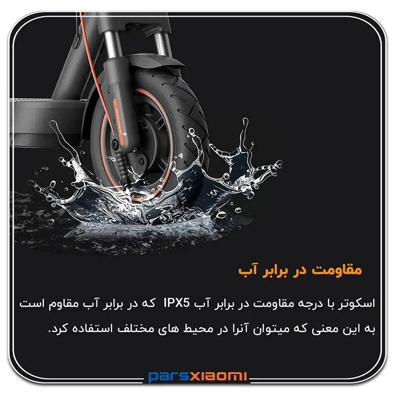 - مقاومت در برابر آب IPX5: با استاندارد مقاومت در برابر آب IPX5، این اسکوتر در برابر پاشش آب از هر جهت محافظت میشود.