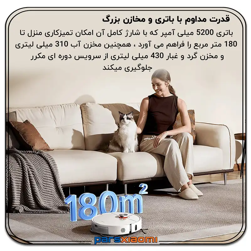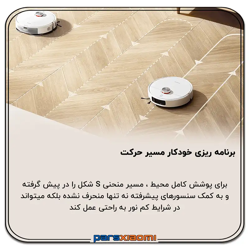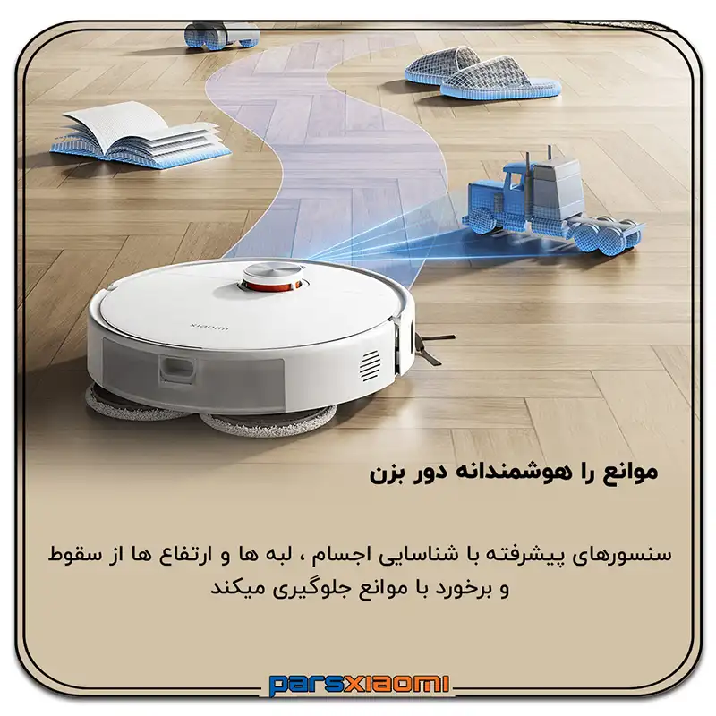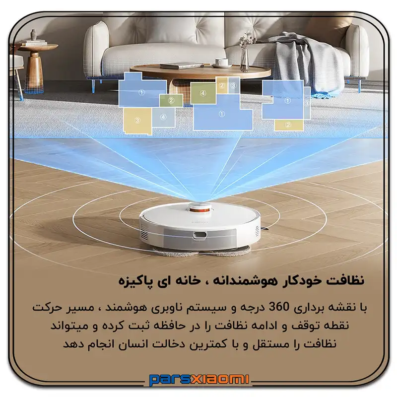 - تشخیص موانع: سنسور لیزری با زاویه دید 129 درجه، موانع را با دقت میلیمتری تشخیص میدهد و از برخورد جلوگیری میکند.