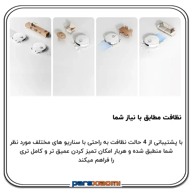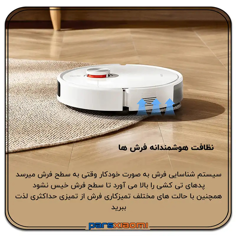 - مدیریت هوشمند فرش: با سنسور اولتراسونیک، ربات به صورت خودکار فرش را شناسایی کرده و پدهای تیکشی را تا 10 میلیمتر بالا میبرد تا فرش خیس نشود. همچنین میتوانید از چهار حالت نظافت برای فرشها در اپلیکیشن استفاده کنید.